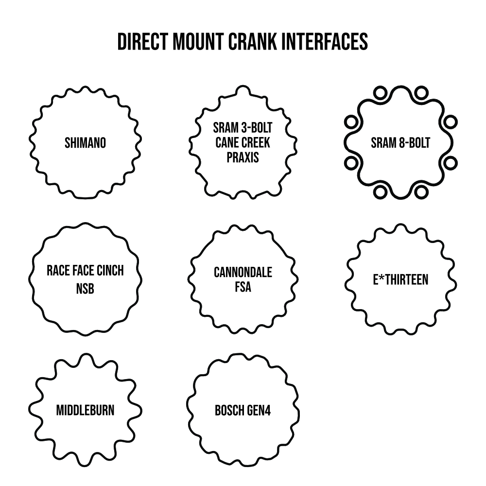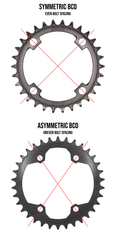 There are symmetrical and asymmetrical chainrings. The drawing below illustrates both types of chainrings, and the table shows the measurements corresponding to each type of BCD.